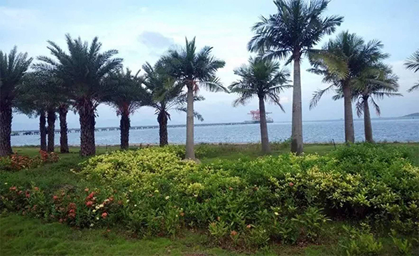 該項目總綠化面積67.7萬(wàn)平方米,其中石化區北側防護林帶西起沿海高速公路石化區出口,東至石化大道,北側為沿海高速公路,南側為北環(huán)路的狹長(cháng)地帶綠化隔離帶,自西向東全長(cháng)約為9188米,綠化總面積約為52.5萬(wàn)平方米。石化區東側防護林帶西接北側防護林帶,東至石化大道路口,分布于北環(huán)路兩側,綠化總面積約為11.6萬(wàn)平方米。中海油倒班宿舍綠化面積約3.6萬(wàn)平方米。東、北側防護林帶工程設計共有苗木約75242株,地被植物約41408平方米??偼顿Y約為1800萬(wàn)元,于2013年3月開(kāi)工,2014年12月竣工驗收。